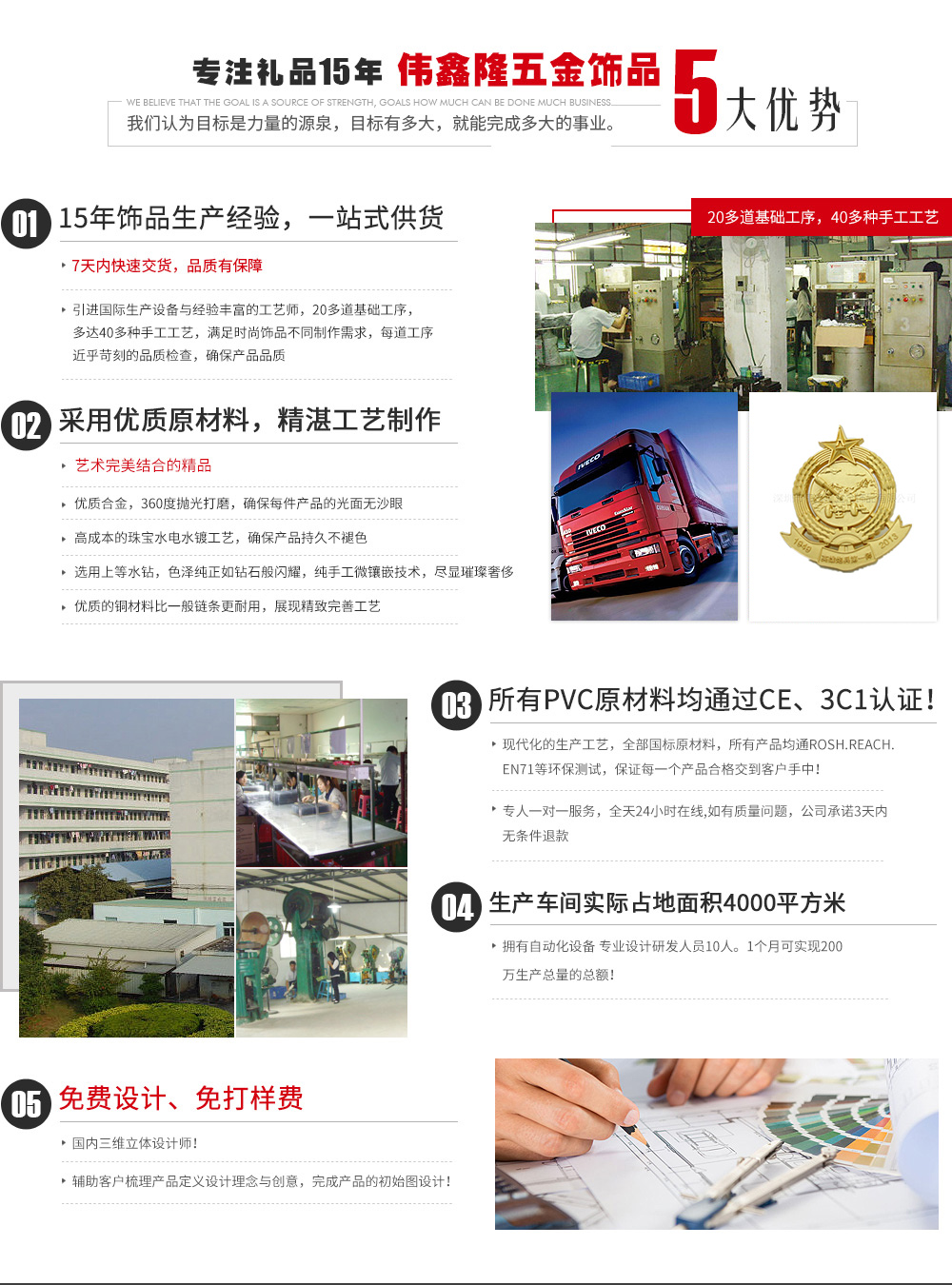 深圳市偉鑫隆五金飾品有限公司位于廣東省深圳市坑梓鎮(zhèn),是一家集設(shè)計(jì)、生產(chǎn)、銷售為一體的專業(yè)五金禮品工藝公司。 公司擁有經(jīng)驗(yàn)豐富的專業(yè)技術(shù)精英團(tuán)隊(duì),至今已有十多年設(shè)計(jì)生產(chǎn)經(jīng)驗(yàn)。 公司自有工廠引進(jìn)先進(jìn)的臺灣設(shè)備及技術(shù),擁有設(shè)計(jì)、繪圖、制模、沖壓、壓鑄、拋光、電鍍、包裝等生產(chǎn)流程,可生產(chǎn)銅、鐵、不銹鋼、鋁、鋅合金、鉛錫合金等材質(zhì)的金屬徽章、胸針、胸章、獎(jiǎng)?wù)隆ⅹ?jiǎng)牌、金屬標(biāo)牌、工號牌、金屬鑰匙扣、狗牌、軍牌、開瓶器、金屬手機(jī)吊飾、錢夾、領(lǐng)帶夾、帽夾、項(xiàng)鏈吊墜、掛包鉤、紀(jì)念章、紀(jì)念幣、袖扣、促銷禮品鑰匙扣、書簽、五金配件、開瓶器等旅游紀(jì)念品及工藝禮品五金飾品。我公司還可根據(jù)客戶樣板開模生產(chǎn)。 公司秉承“精...